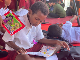 Buku-buku ini merupakan sumbangan dari Perpustakaan Nasional dan Komunitas Kargo Baca untuk disalurkan kepada anak-anak yang tinggal di daerah pesisir yang sulit dijangkau, dimana kegiatan tersebut didukung penuh oleh Kepala Staf Angkatan Laut, Pangkoarmada III dan Komandan Satuan Kapal Amfibi (Dansatfib) Koarmada III, ungkap Komandan KRI KRI Teluk Weda-526.